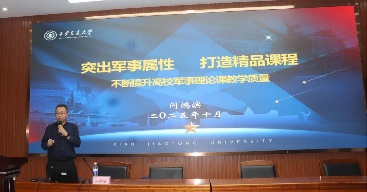 问鸿滨教授是教育部全国普通高校军事教学指导委员会委员、陕西省普通高校军事课教学指导委员会副主任,长期从事高校国防教育研究与教学实践。讲座中,他结合自身30余年的教学与课程建设经验,系统分析了当前高校军事理论课面临的主要问题,深入解读了《普通高等学校军事课教学大纲》等最新政策文件,并分享了西安交通大学在军事理论课程建设、教学改革、课程思政融合等方面的成功经验。