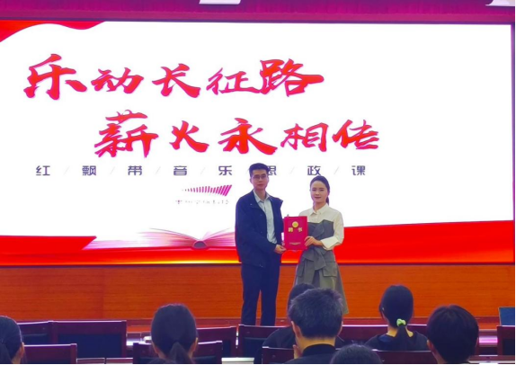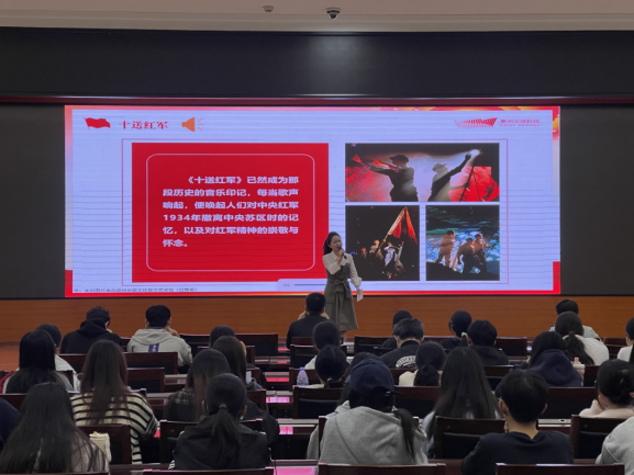 活动上,通识教育学院副院长周展锋博士为王韦老师颁发学校美育中心金葵声乐艺术基地特聘专家聘书。随后,王老师用音乐的形式带领师生们重走长征路,以《十送红军》等歌曲为引,结合党史讲解与现场演唱,将革命历史娓娓道来。在场师生在红色旋律中体会到了红军将士的崇高信仰与无畏精神。最后,全体师生齐唱《我和我的祖国》,嘹亮的歌声汇聚成新时代青年的奋斗誓言,让红色基因在旋律中薪火相传。