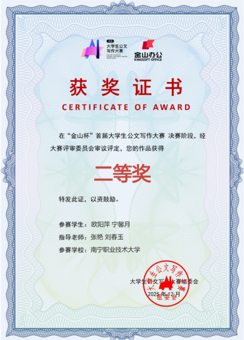 本次大赛由北京金山办公软件股份有限公司主办,首都师范大学等十三所高校联合协办,国际应用写作学会等给以学术支持。大赛自2025年4月举办以来,文化艺术团队刘春玉、张艳两位老师全程参与,并认真组织校内选拔赛和培训,进行一对一线上线下指导,其中34人进入华南区复赛。最终,在全国决赛中荣获一等奖1个,二等奖1个,这充分展示了我校《大学语文》《阅读与写作》等语文公共基础课教育教学成果。