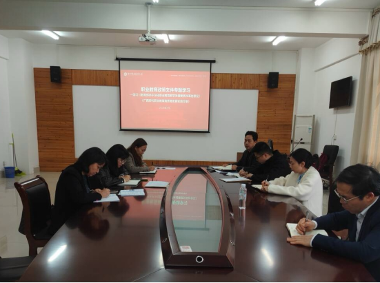 3月11日,通识教育学院在综合楼425会议室召开职业教育政策文件专题学习会,学习《教育部关于深化职业教育教学关键要素改革的意见》《广西现代职业教育高质量发展实施方案》,会议由学院副院长阳代军主持,全体教职工参会。
