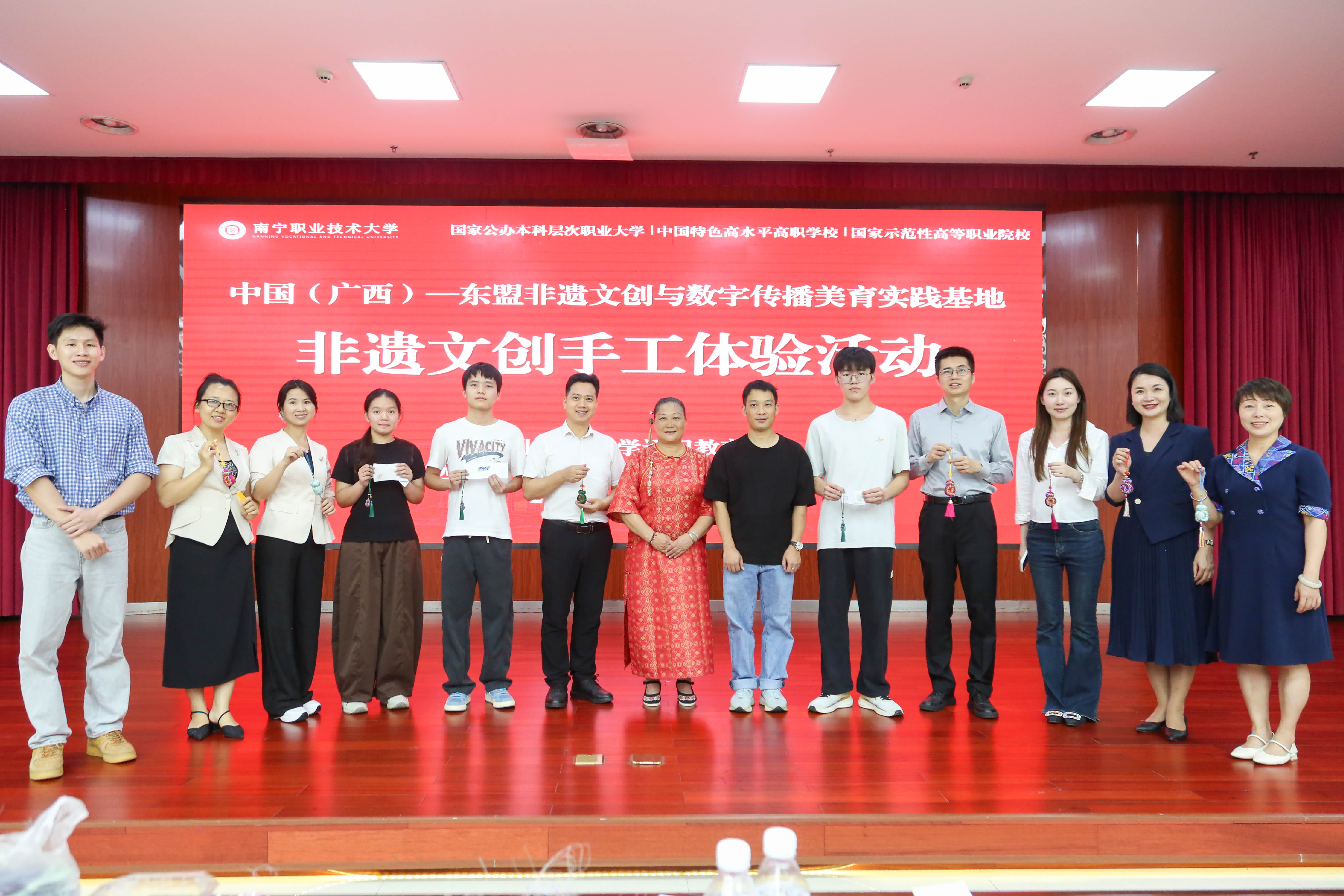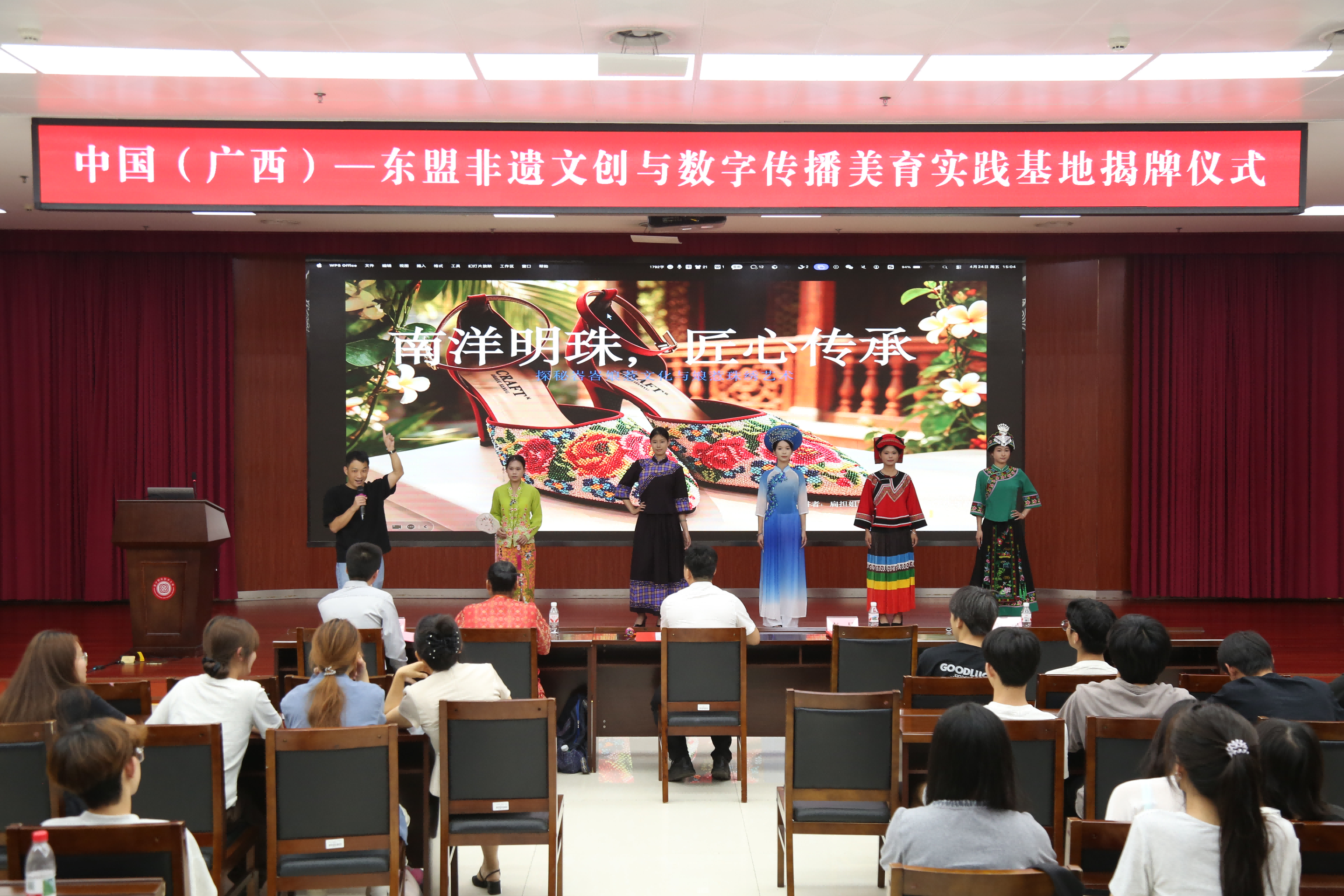 4月24日,“中国(广西)—东盟非遗文创与数字传播美育实践基地”在南宁职业技术大学揭牌。校企双方以非遗为媒、数字为翼,探索“非遗+数字+东盟”融合育人新路径,并将马来西亚娘惹服饰与珠绣技艺引入校园。学校通识教育学院副院长阳代军,广西百色市扁担姐文化传播有限公司董事麦琼方、总经理韦晶、新媒体运营总监黄智等出席仪式。通识教育学院副院长周展锋主持活动。